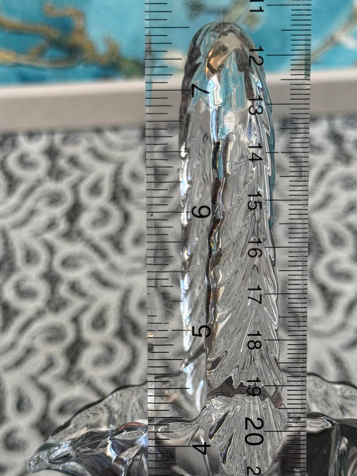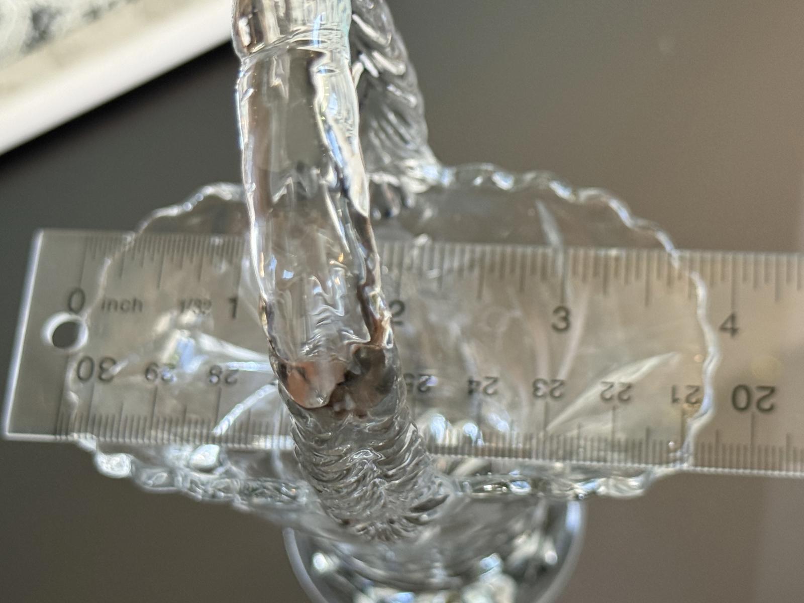 This clear glass basket stands 10" tall, and the basket portion measures 5.5" x 3.25". Some of the leaf and part of the flower designs are moulded into the basket, while the rest of the flowers and petals are engraved into the glass.