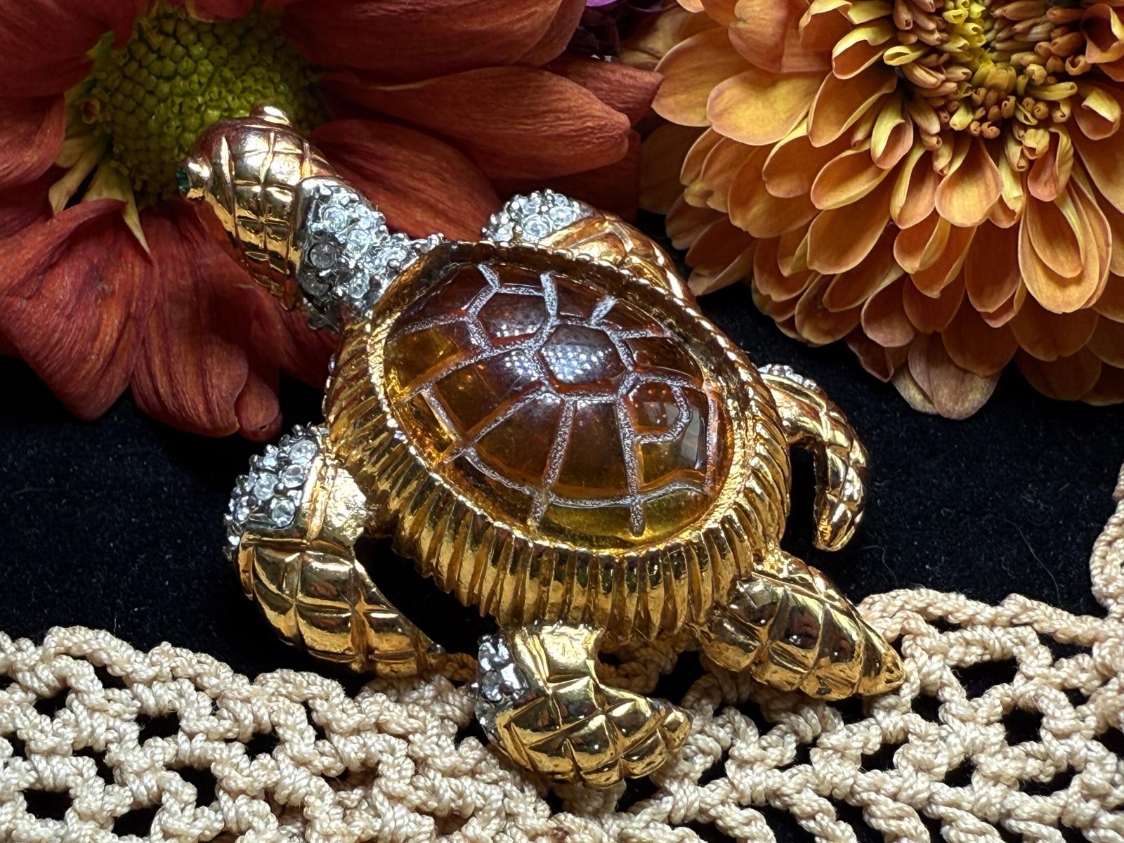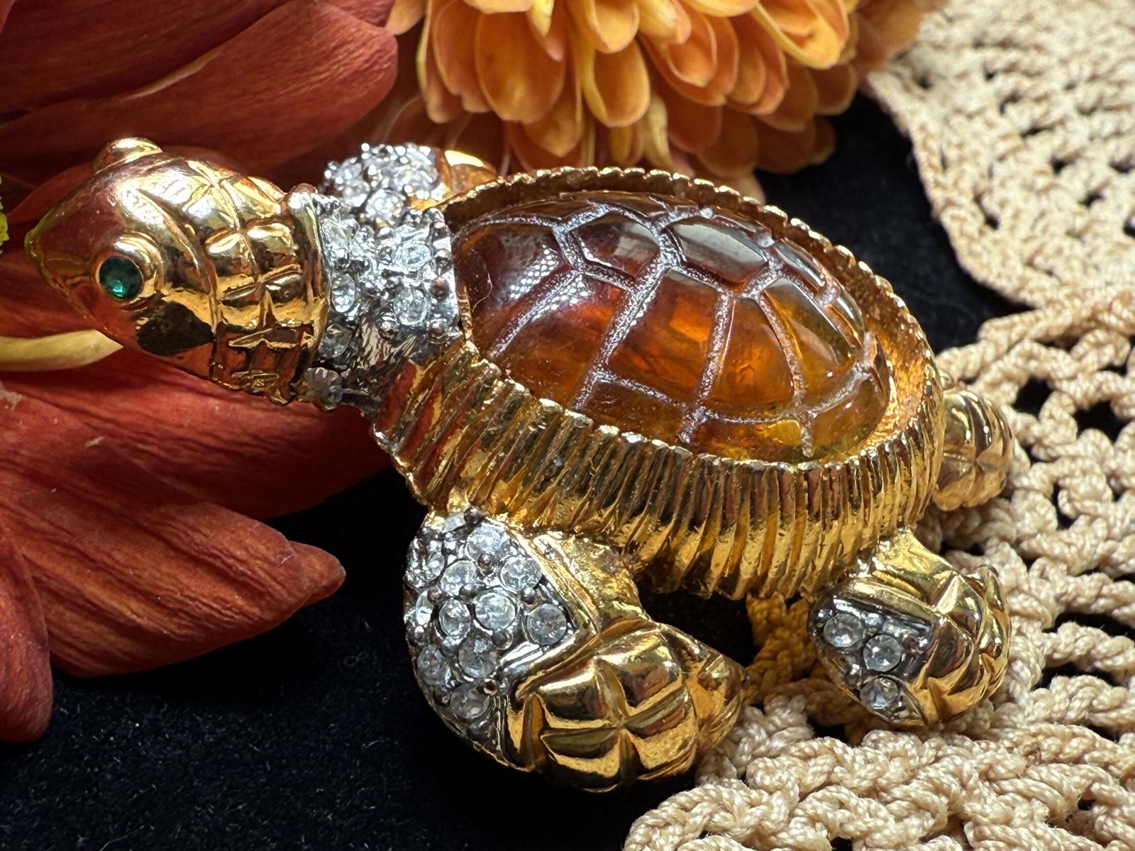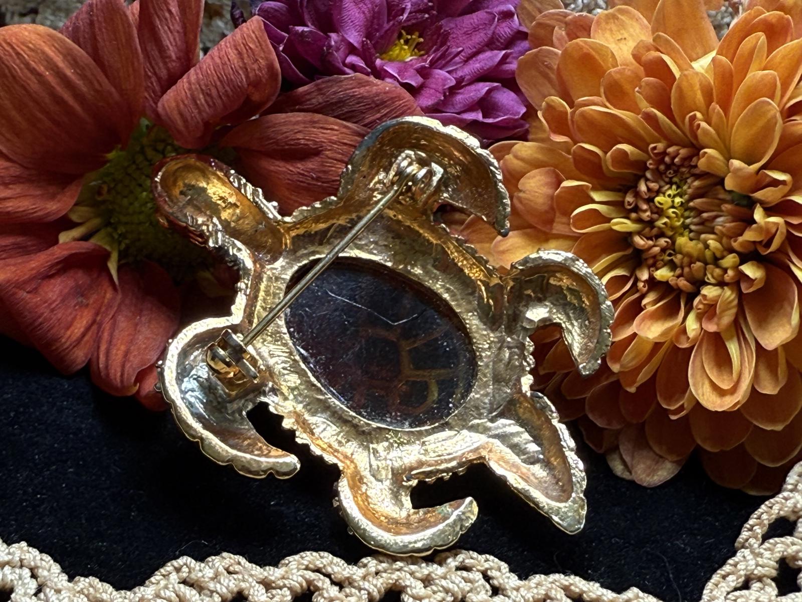 Multicolored Sea Turtle Brooch Jeweled Rhinestone Gold Tone Amber Lucite Belly