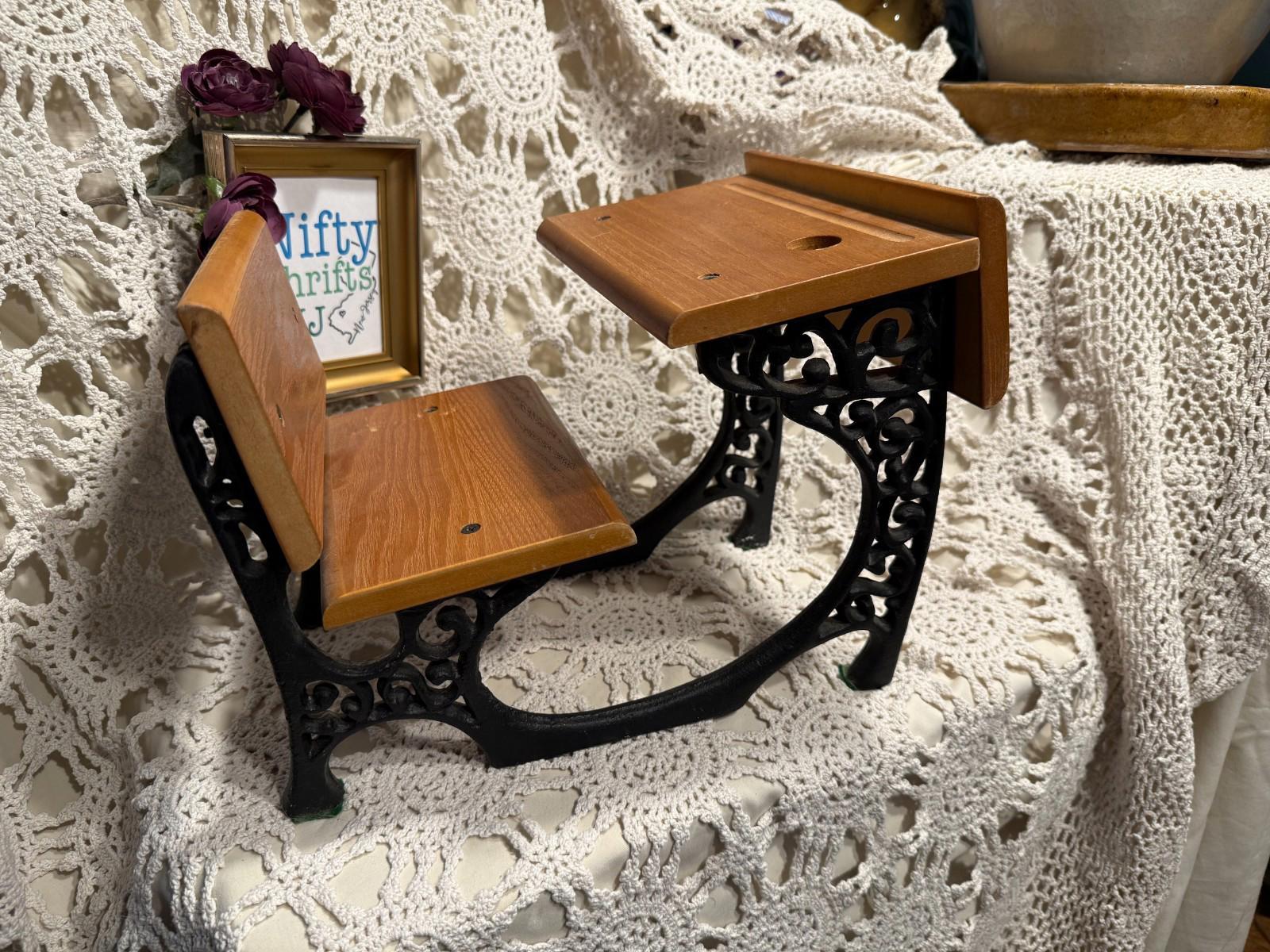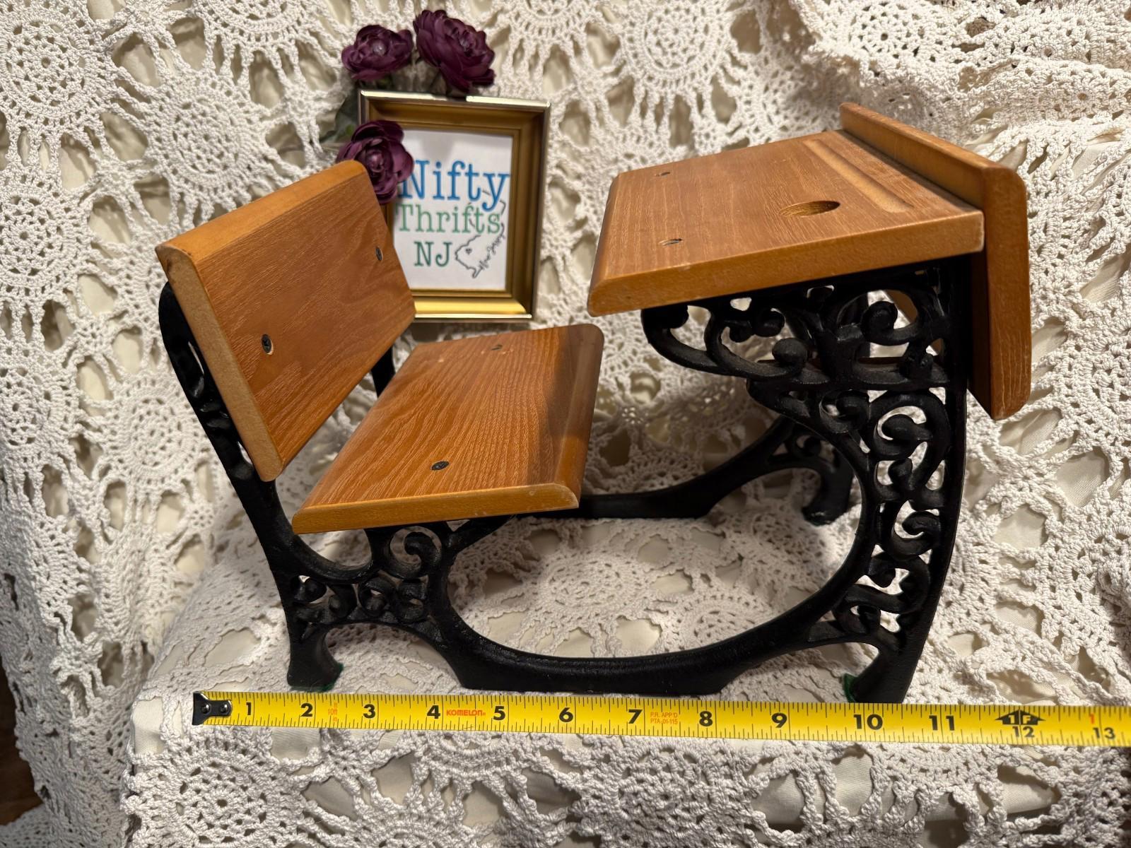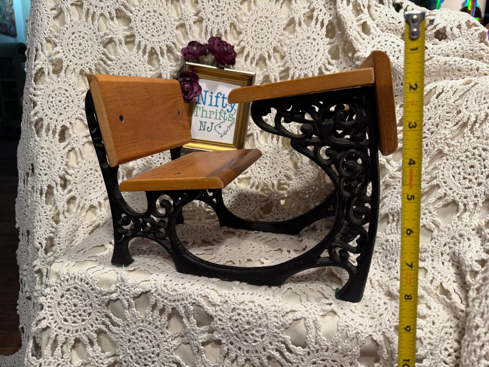 Vintage 1960's Miniature Children Toy Doll Collector Wrought Iron & Wooden Desk Measures 8" wide, 9" high, and 11-1/2" deep. Quite heavy, weights 7 lbs.