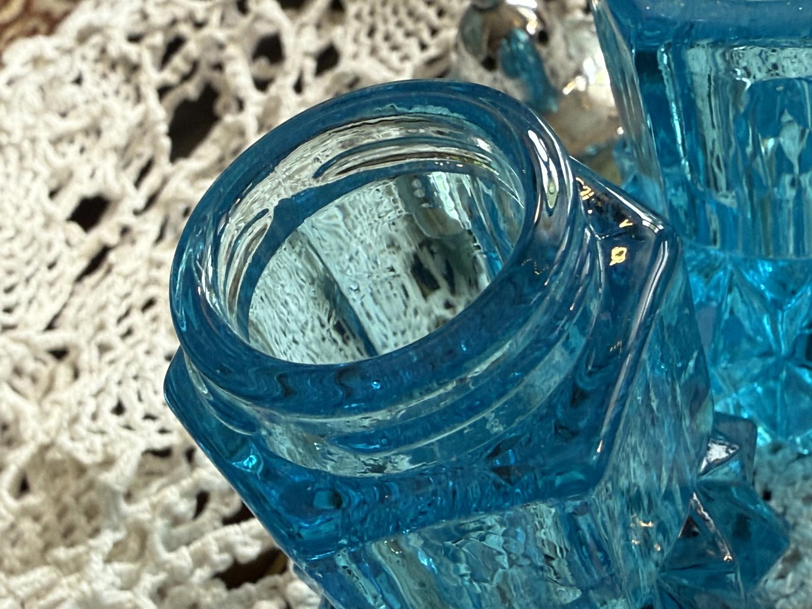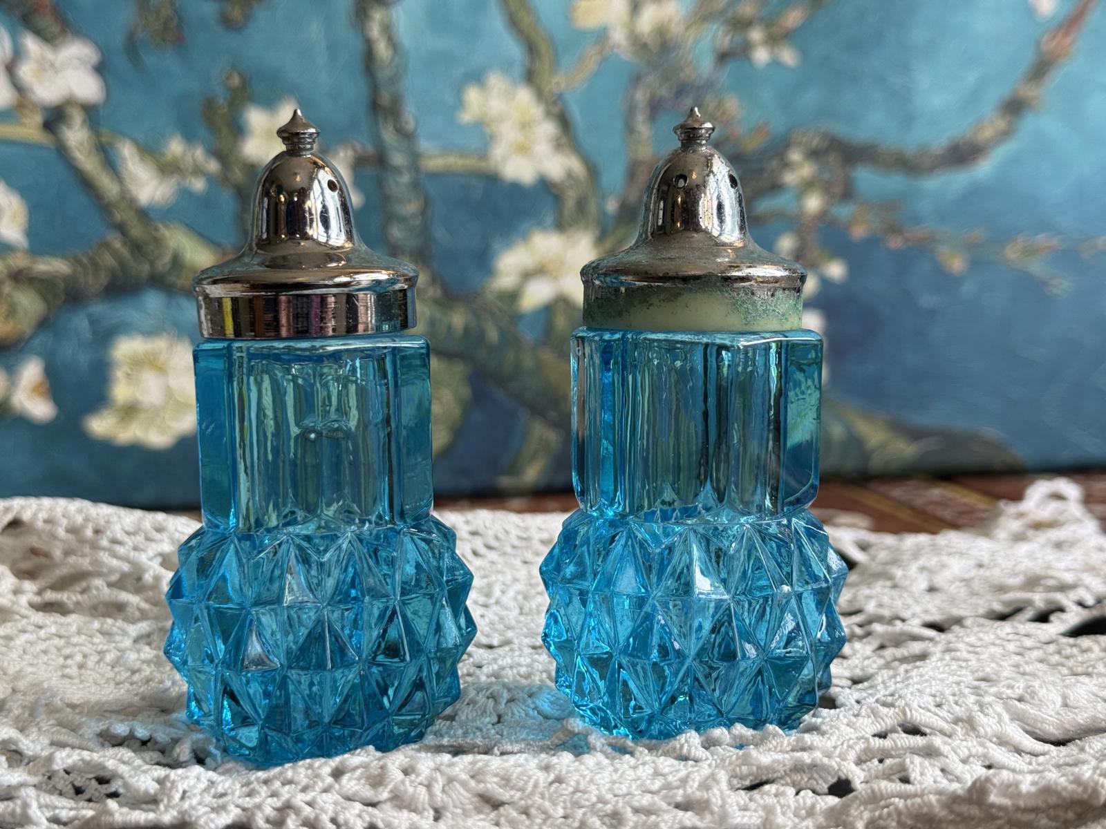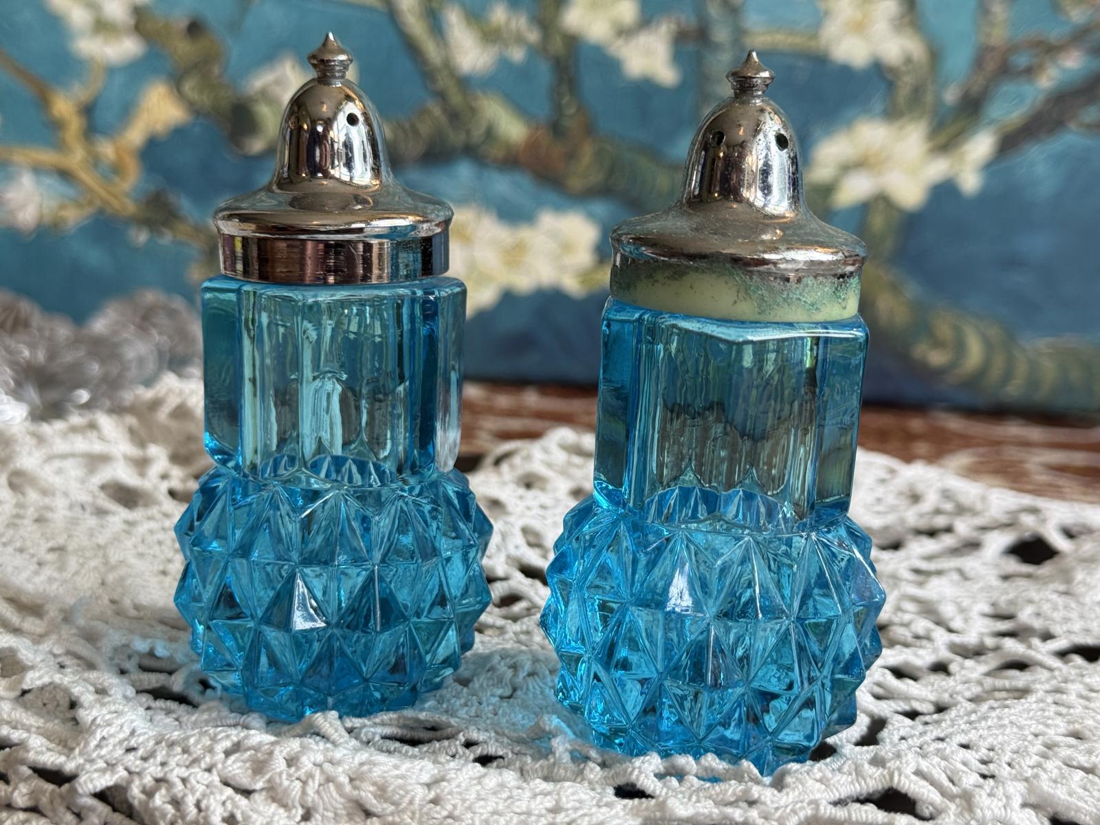 Vintage Aqua Blue Glass Salt & Pepper Shakers Indiana Glass Diamond