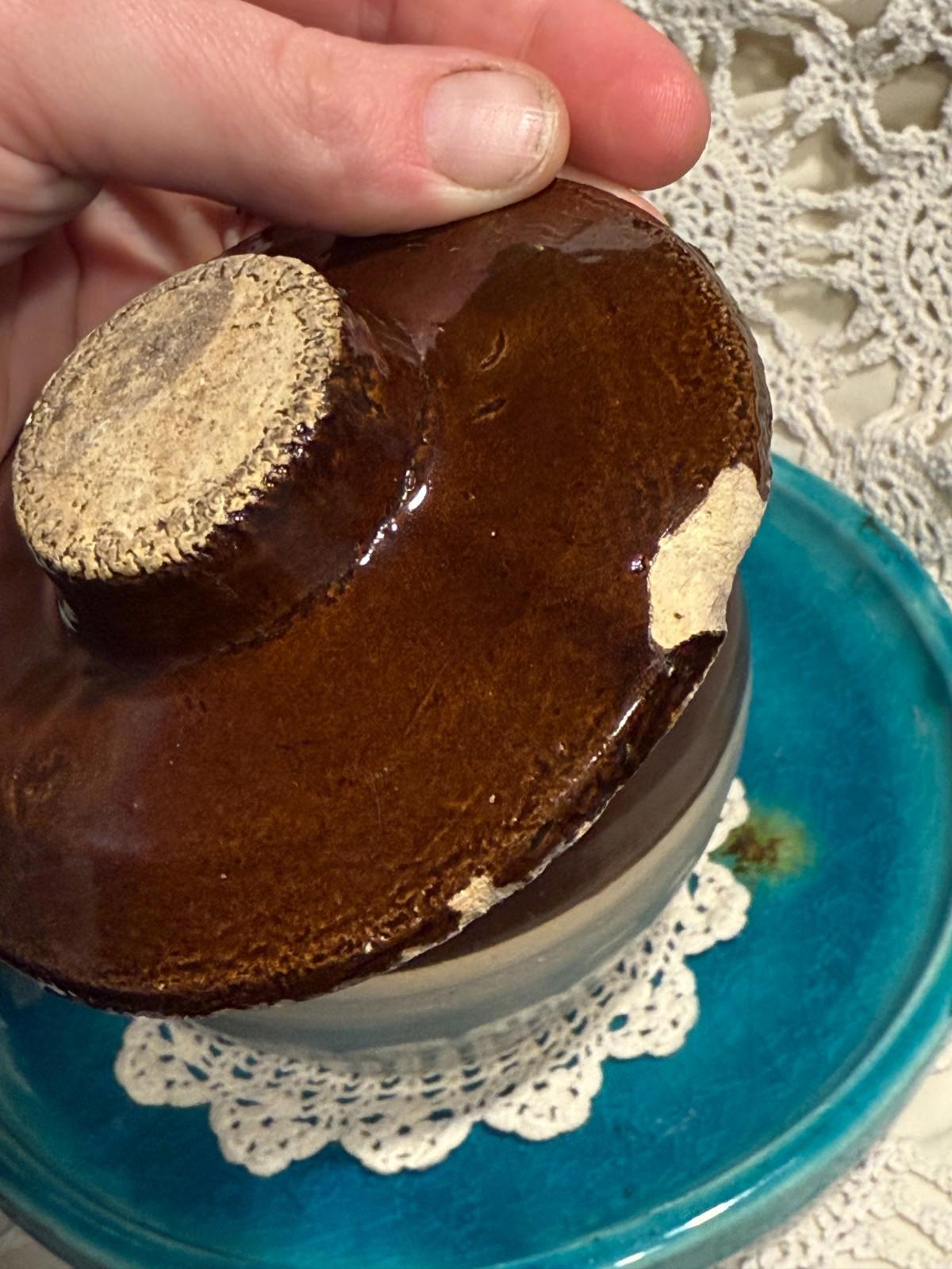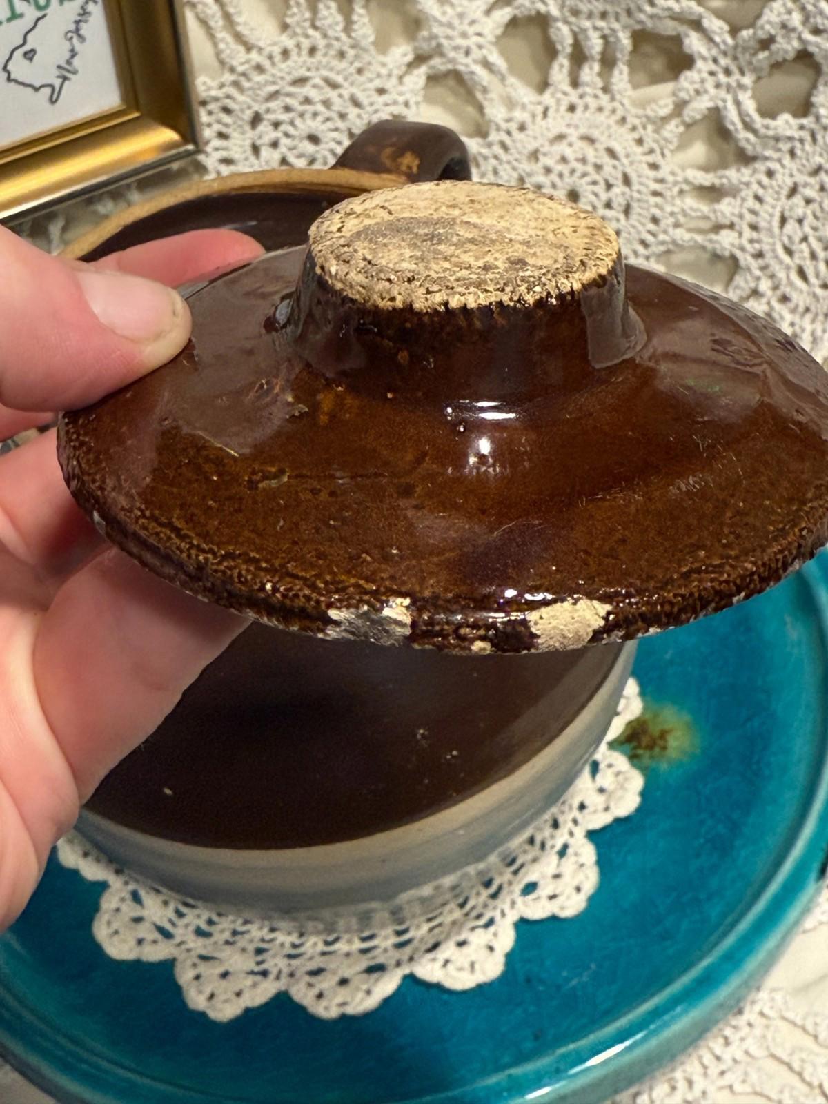 Vintage Bean Pot hand thrown clay pottery two tone with small chips on lid