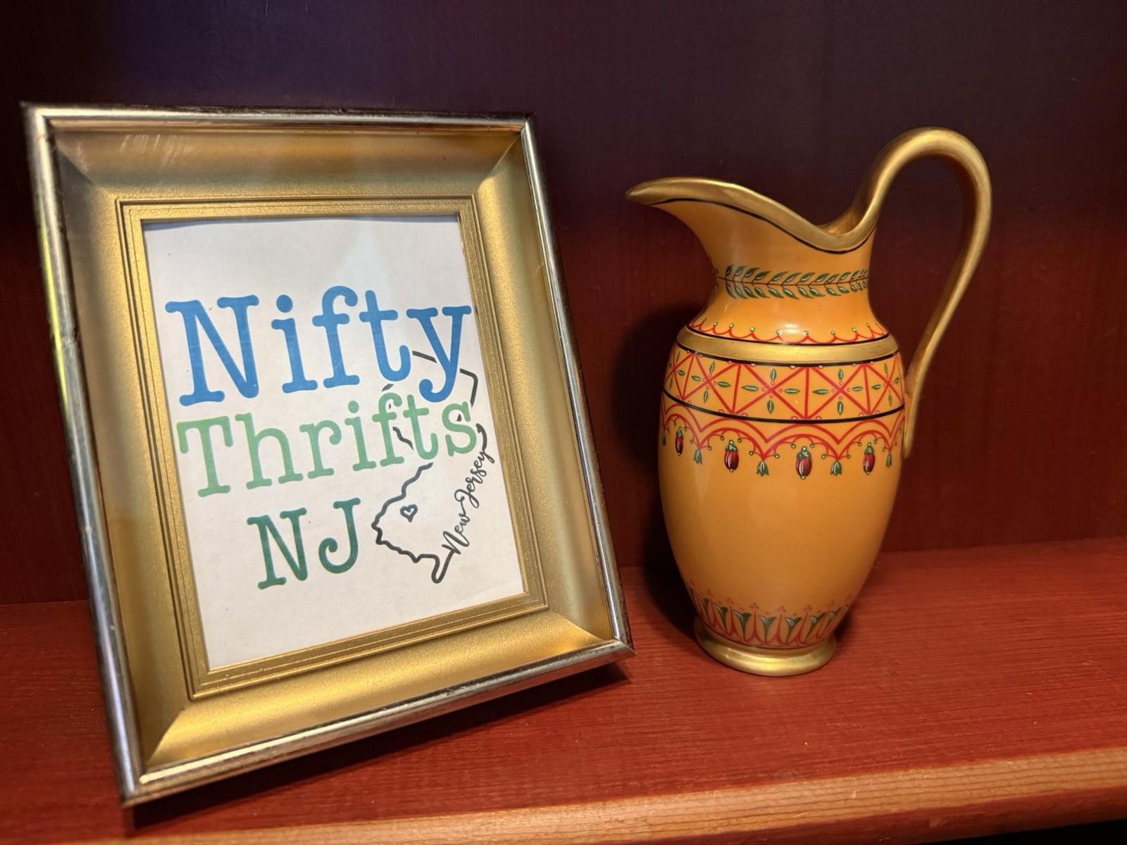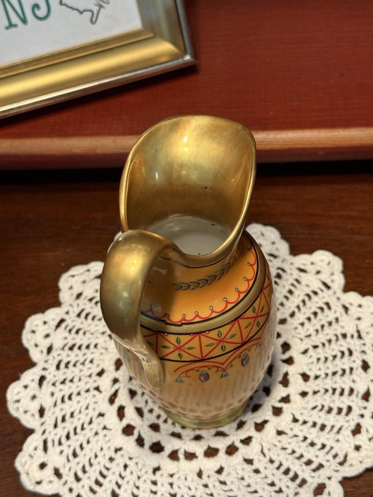 Franklin Mint fine porcelain creamer, miniature vase, museum replica - yellow, gold, red, Greek ewer or jug - vintage treasure