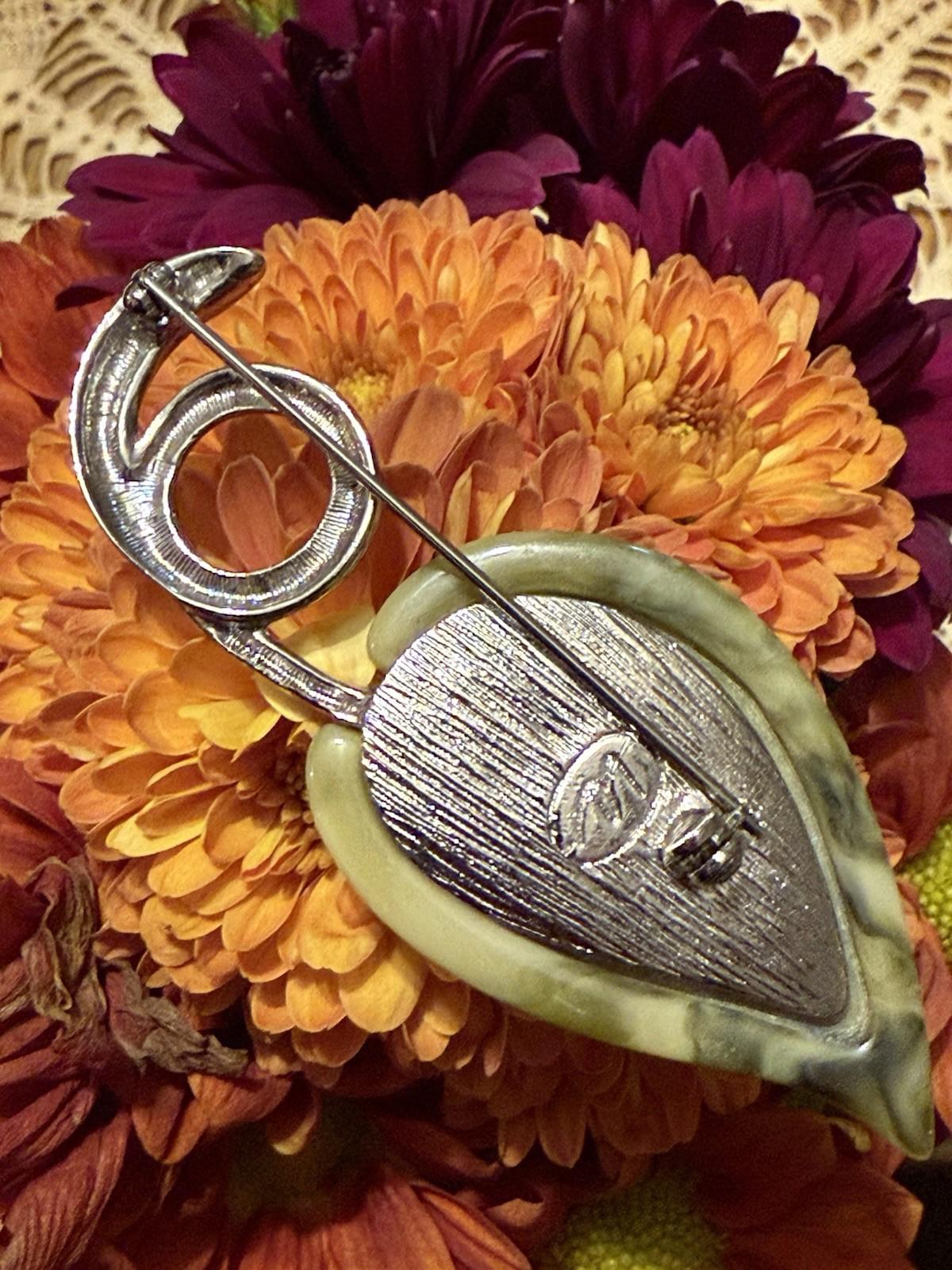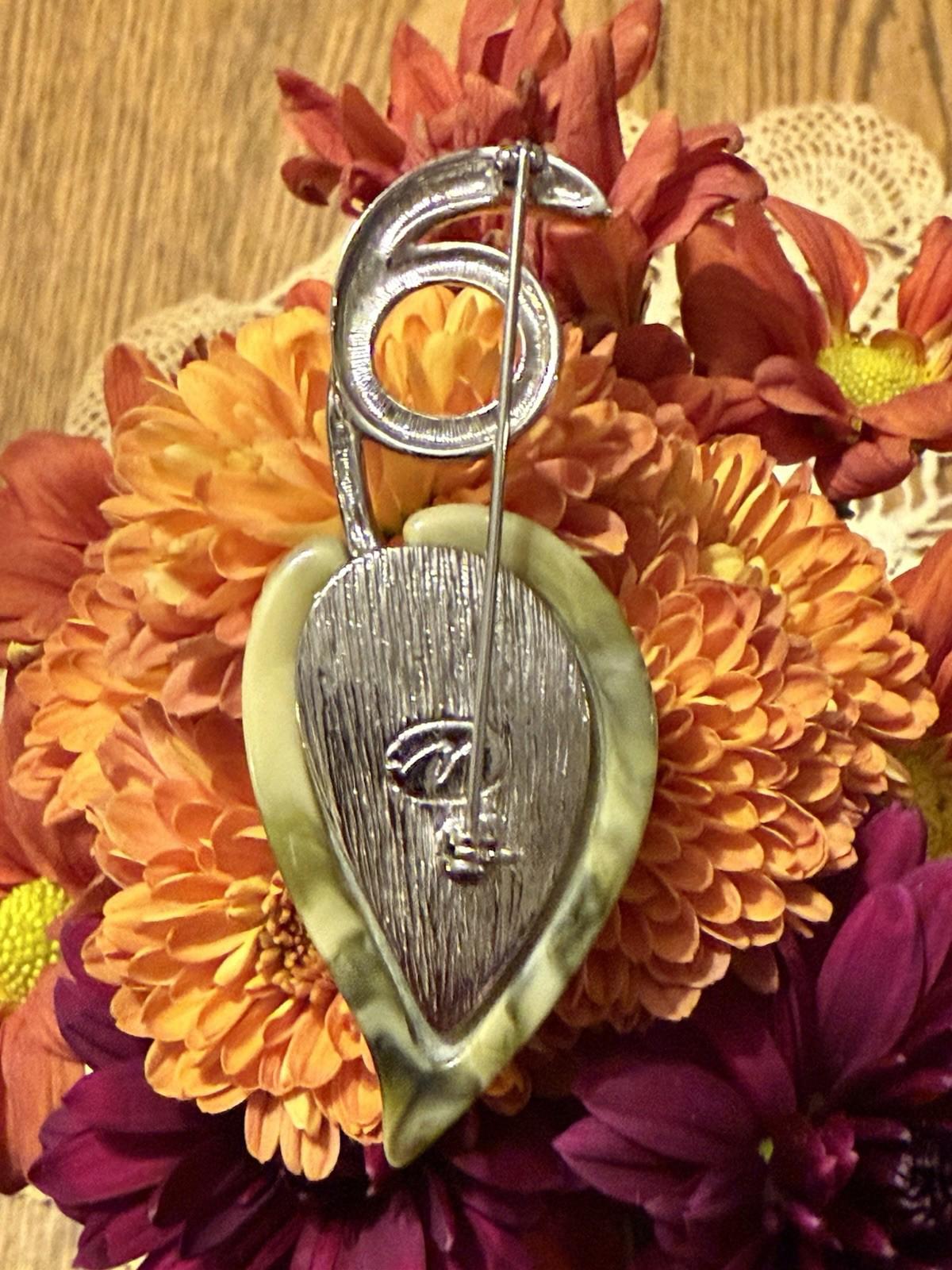 The product is a vintage Liz Claiborne green brooch pin featuring a classic design with green and silver tones. This stylish accessory adds a touch of elegance to any outfit, making it a versatile and timeless piece of vintage jewelry. Perfect for collectors or those looking to add a unique flair to their wardrobe, this brooch pin from Liz Claiborne is sure to stand out with its vibrant colors and eye-catching design.