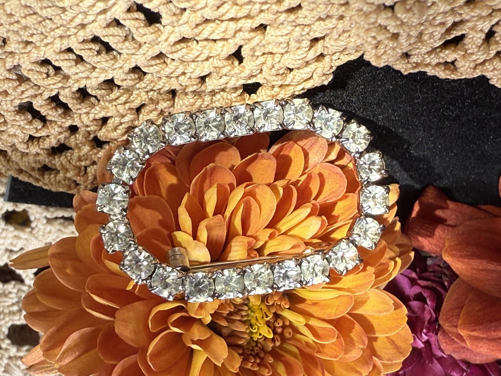 Elegant vintage oval brooch featuring clear rhinestones set in a silver-tone metal base.