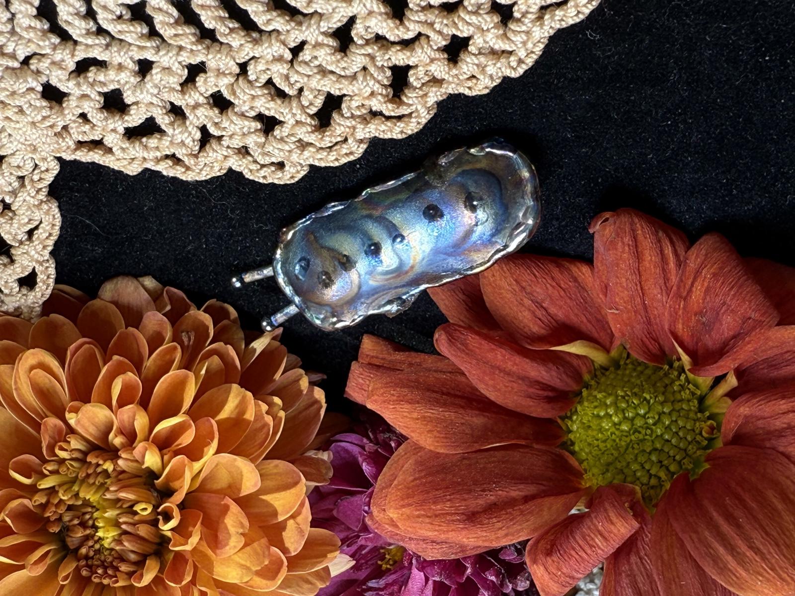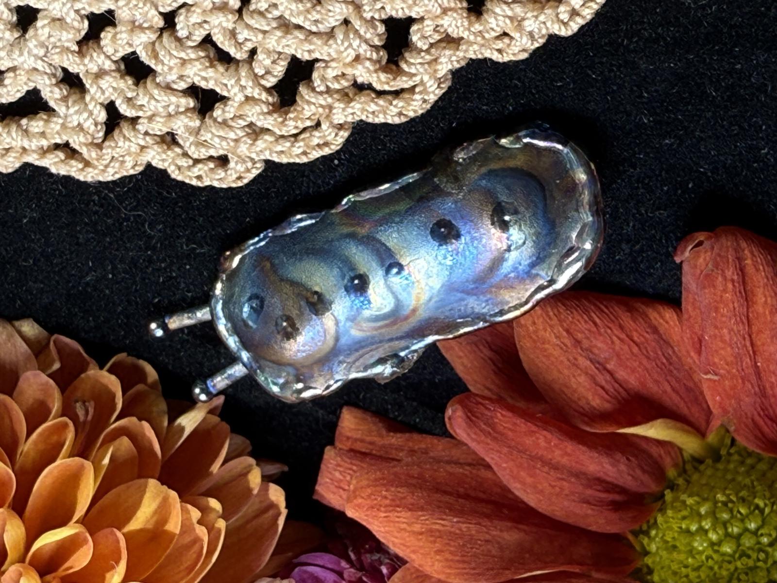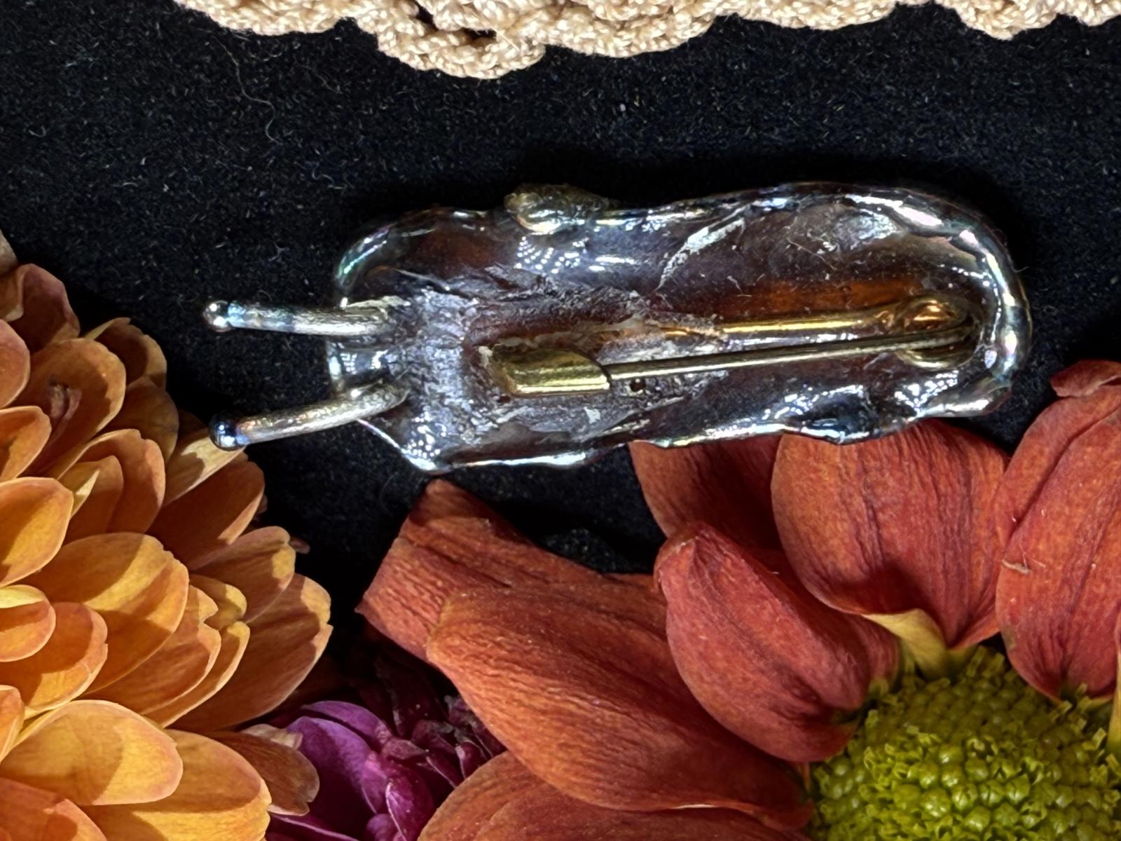 Vintage slug-shaped brooch pin made of metal with a unique patina finish.